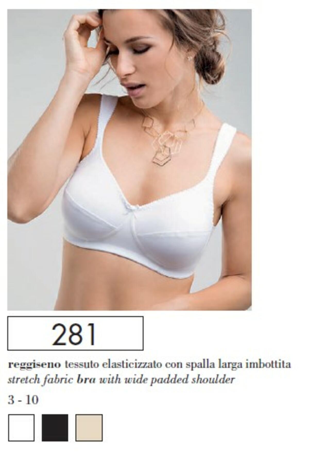 REGGISENO SENZA FERRETTO IN TESSUTO ELASTICIZZATO, COPPE FODERATE IN COTONE CON SPALLA LARGA IMBOTTITA.