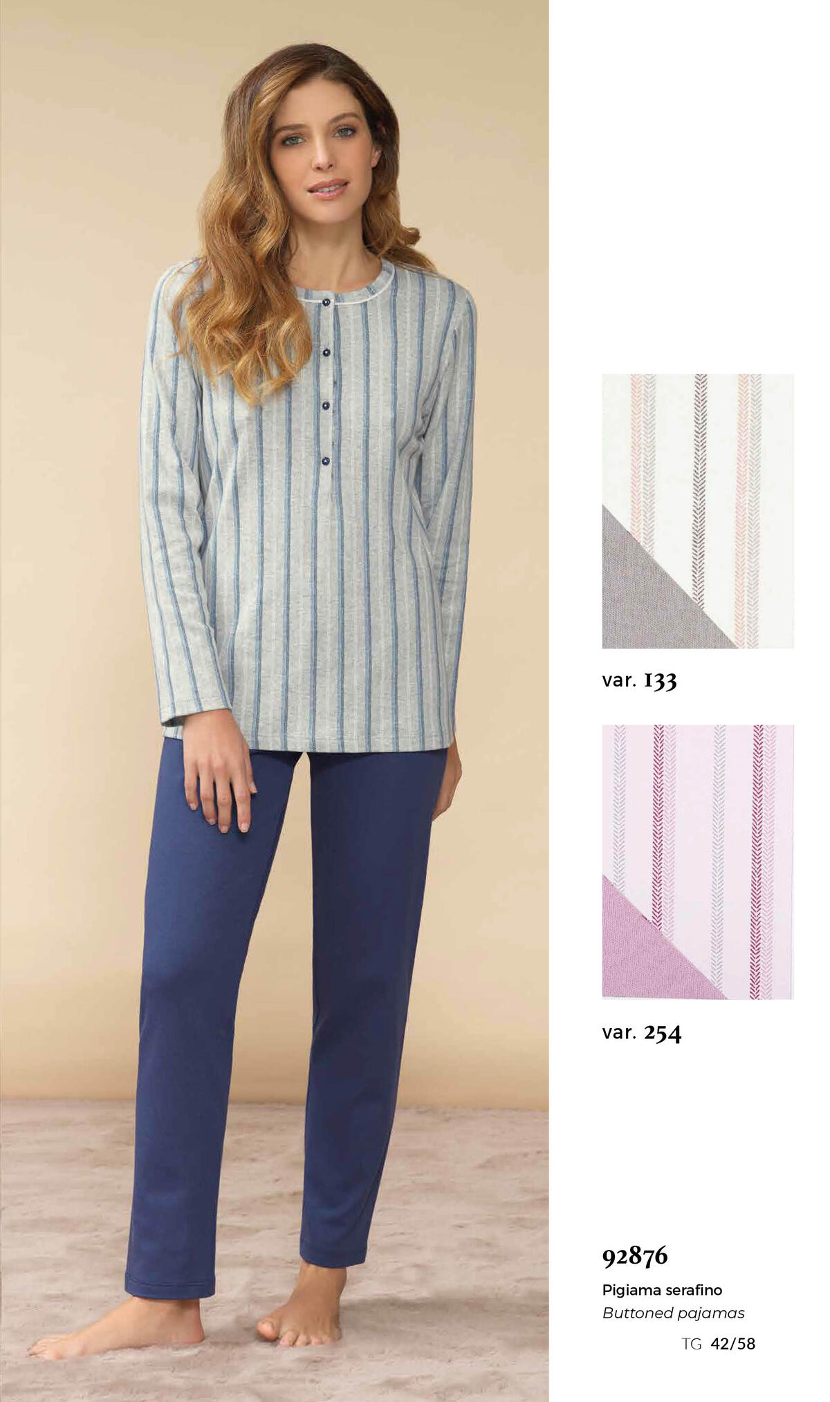 PIGIAMA DA DONNA IN COTONE INTERLOCK. MAGLIA SERAFINO A FANTASIA. PANTALONE LUNGO COLORE UNITO CON CINTURA ELASTICIZZATA.