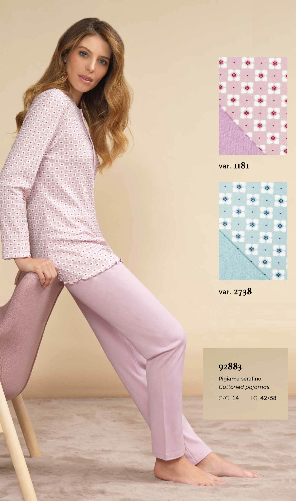 PIGIAMA DA DONNA IN COTONE INTERLOCK. MAGLIA SERAFINO A FANTASIA. PANTALONE LUNGO COLORE UNITO CON CINTURA ELASTICIZZATA.
